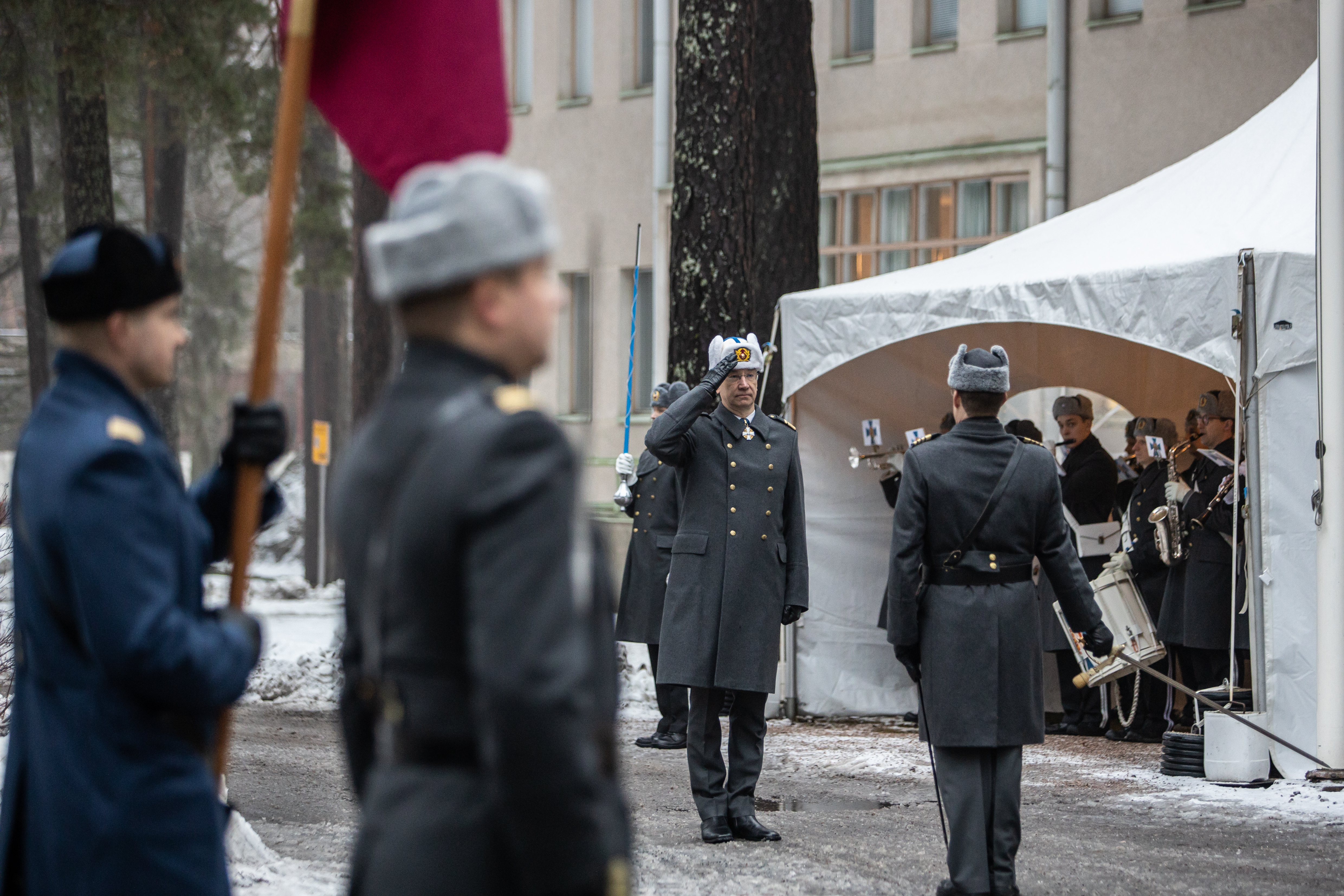 Seppeleenlaskusta siirryttiin kampusalueelle Maanpuolustuskorkeakoulun rehtorin, kenraalimajuri Mika Kalliomaan johtamaan ja vararehtori, eversti Rainer Peltoniemen komentamaan paraatikatselmukseen sekä kenttärovasti Risto Kaakisen toimittamaan kenttähartauteen.