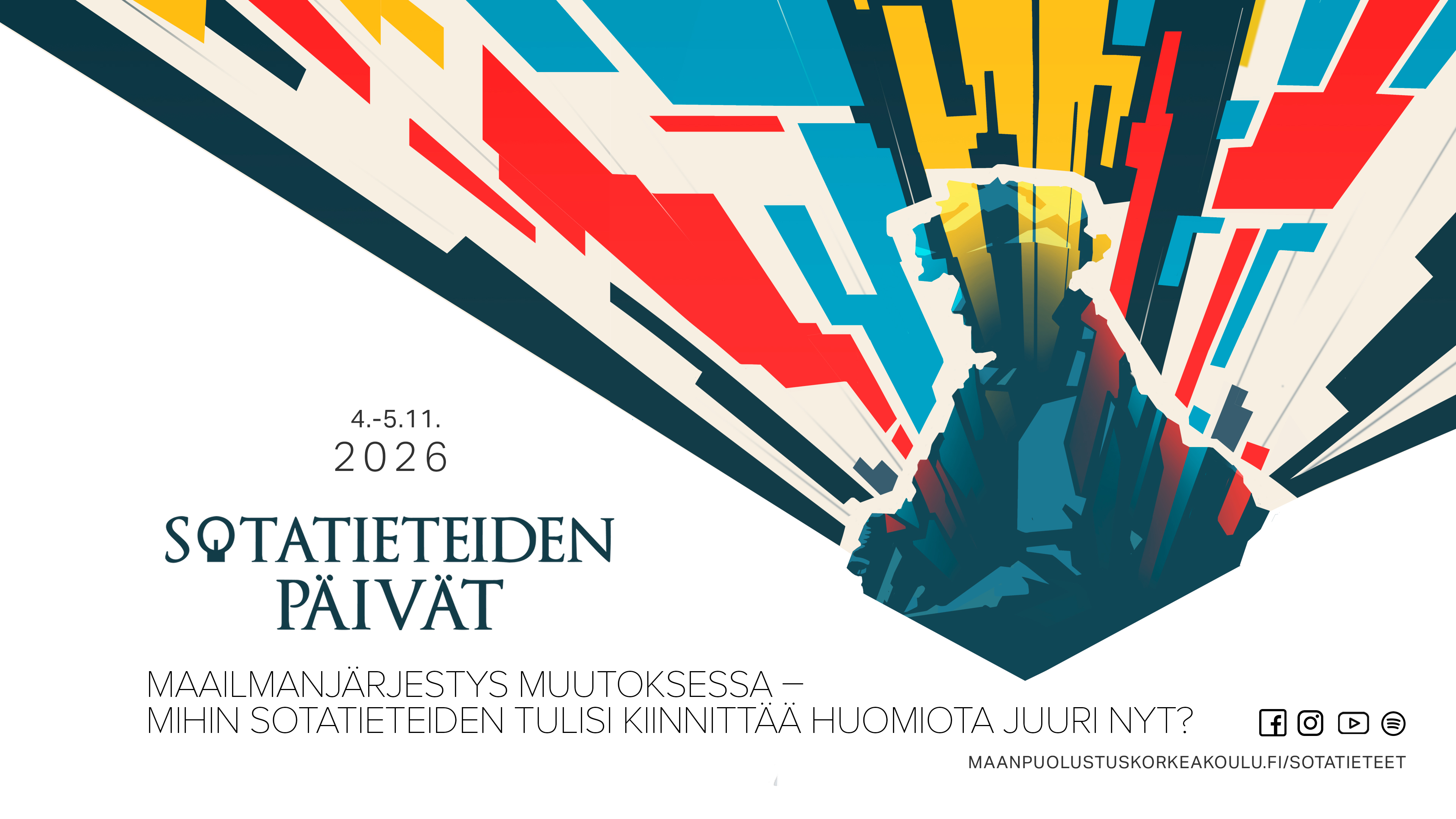 Maanpuolustuskorkeakoulu ja Suomen Sotatieteellinen Seura ry järjestävät sotatieteiden päivät 4.-5. marraskuuta. Vuoden 2026 Sotatieteiden päivien teema Maailmanjärjestys muutoksessa – mihin sotatieteiden tulisi kiinnittää huomiota juuri nyt? on keskustelunavaus ajankohtaisista sotatieteellisistä ja sotatieteitä lähellä olevista ilmiöistä ja teemoista tutkimuksen, opetuksen sekä upseerin käytännön ammatinharjoittamisen näkökulmista.