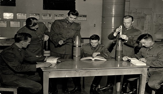 The photo illustrates studying relating to ordnance and ammunition: Students of what was then called the Higher Officer Course 4 examining ammunition back in 1958.