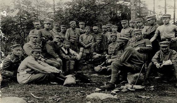The photo pictures students on the course of 1918: Students of the Artillery School at the artillery camp of Kaukjärvi in July 1918.