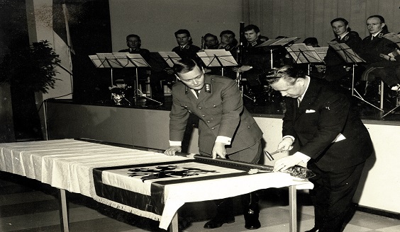 To mark the Artillery School’s 50th Jubileum, the nailing of the Artillery School Colour took place in 1968 as the Artillery School received its Colour. The Colour nailing ceremony was conducted by Minister of Defence Sulo Suorttanen with the assistance of Captain Matti Koskimaa.