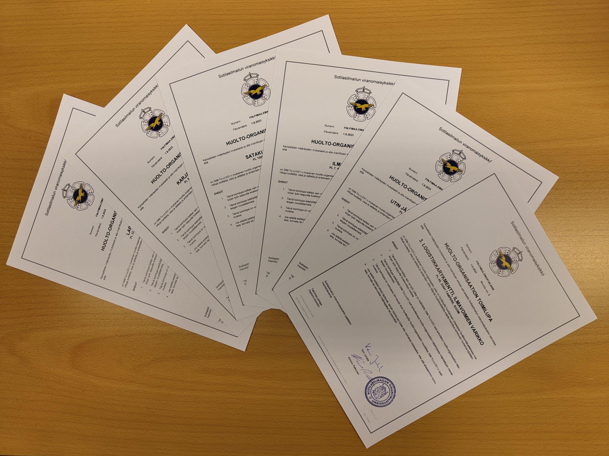 The military aircraft maintenance organisation approvals issued to the Satakunta Air Command, Lapland Air Command, Karelia Air Command, Air Force Academy, Utti Jaeger Regiment and 3rd Logistics Regiment of the Defence Forces Logistics Command were reclassified from fixed-term approvals to approvals of an indefinite duration on 1 August 2023. A corresponding approval has earlier been granted to companies in the defence industry (Patria Aviation Oy, Insta ILS OY, Finnair OYJ and Millog Oy).