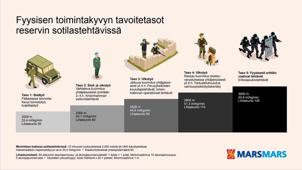 Puolustusvoimat on määrittänyt fyysisen toimintakyvyn tehtäväkohtaiset tavoitteet kaikille asevelvollisille. Tavoitteet perustuvat sodan ajan tehtävän fyysisiin vaatimuksiin, eli niihin ei vaikuta esimerkiksi henkilön sukupuoli, ikä tai koulutustausta. Tehtävät on jaettu viiteen pääluokkaan kuvan mukaisesti.
